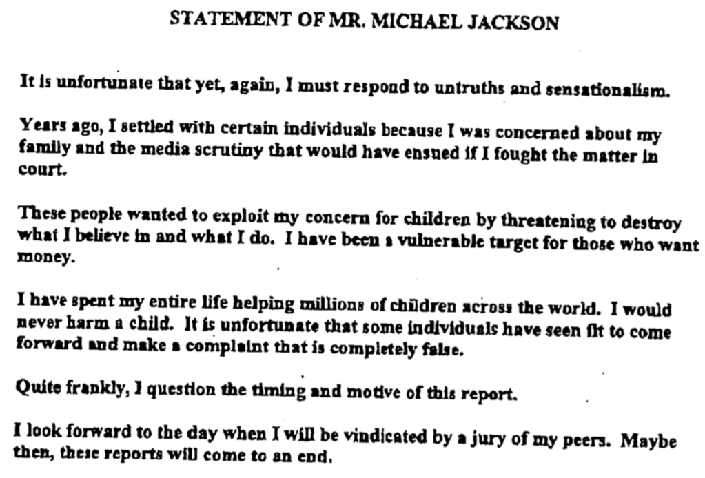 Michael Jackson released this public statement live from Neverland in 1993 shortly after the allegation of Jordan Chandler accusing him of molesting him broke into the news.